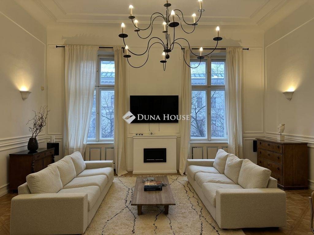 Kiadó az Andrássy út egyik patinás, nagypolgári épületének 2. emeletén egy igényesen felújított, 128 négyzetméteres, nappali + két hálószobás lakás.