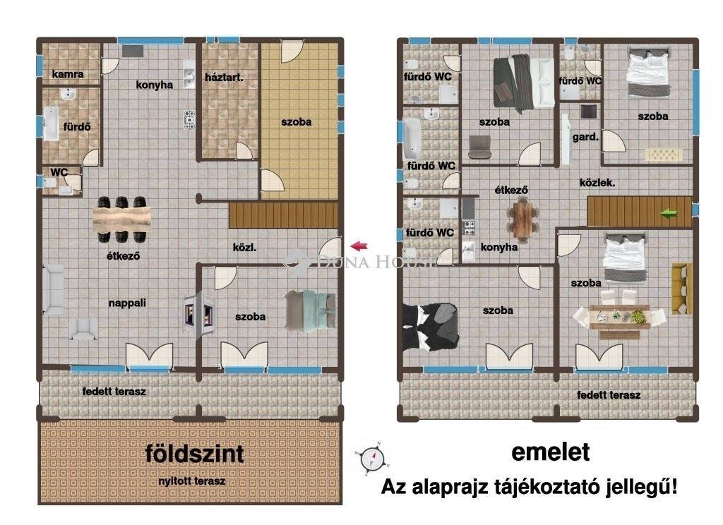 Az emeleten további szobák vannak, melyből háromhoz külön fürdőszoba WC-vel kapcsolódik,