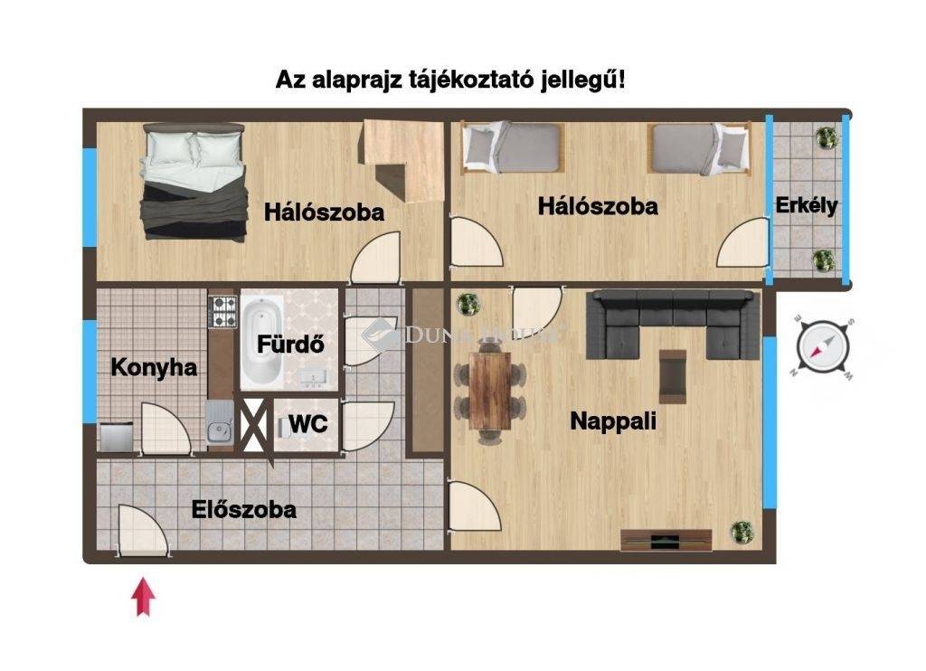 Nappali + 2 hálószoba, ablakos, világos étkezős konyha, fürdőszoba, külön mellékhelyiség, előszoba, közlekedő (beépített szekrénnyel), valamint egy beépített erkély alkotja. A lakás bútorozott, a képeken látható berendezéseket, gépeket tartalmazza.