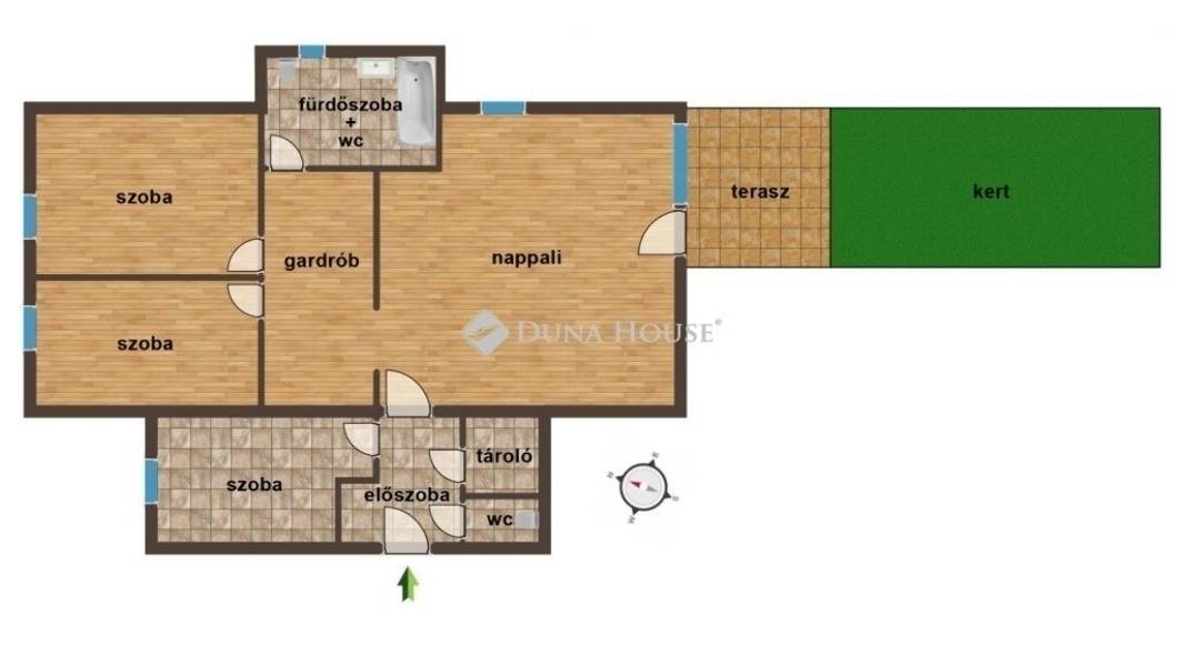 A lakás elrendezése átgondolt és élhető. A tágas nappaliból közvetlen kijárat nyílik a teraszra és a kertbe, amely tökéletes helyszíne lehet reggeli kávéknak, családi pillanatoknak vagy esti kikapcsolódásnak. A fürdőszoba kádas kialakítású, a WC külön helyiségben található. A gépészeti rendszer és a nyílászárók kiváló állapotban vannak, az otthon komfortját biztonsági bejárati ajtó, klímaberendezés és műanyag nyílászárók egészítik ki.