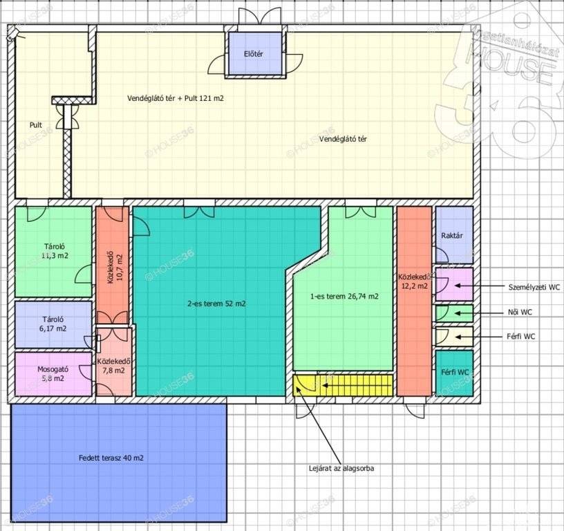 - 121 m2-es vendéglátó tér és további, külön megközelíthető privát termek (27 m2 és 52 m2)