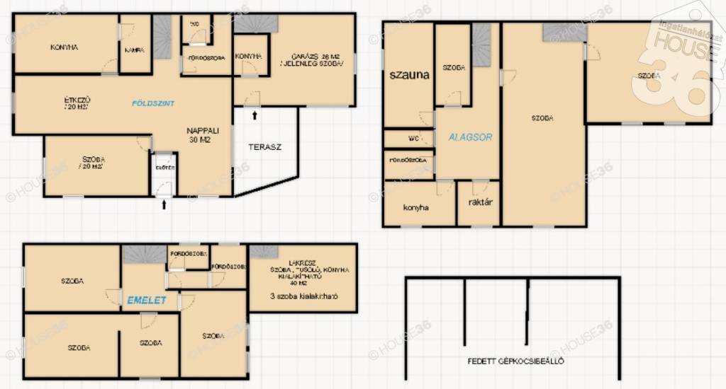 161 m2-es földszint, brutto 90 m2 emelet, 140 m2 alagsor