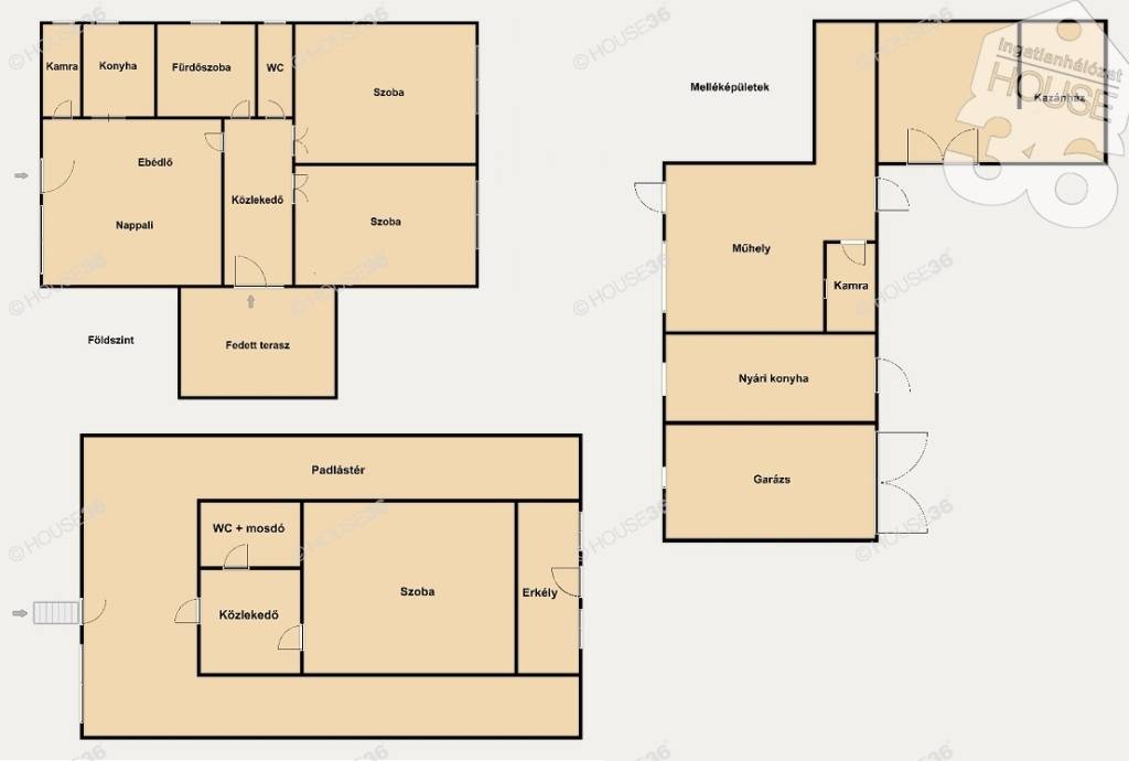 Kb. 60 m2-es, több helyiségből (garázs, nyári konyha, műhely, kazánház, tűzifatároló) álló melléképület;