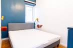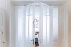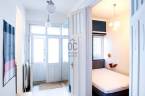 Nappalija az Október 6. utcára néz, egyik oldalán padlótól-plafonig végig futó gardróbbal.