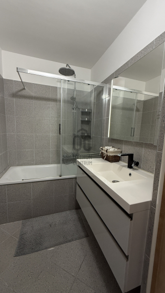 A fürdőszobában márvány kézmosó és egy különleges, 3 utas csapteleppel szerelt kád található, kényeztető esőzuhannyal.