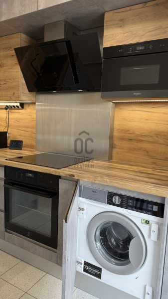 Beépített LIEBHERR hűtő-fagyasztó és beépített AEG mosógép, nagy teljesítményű szagelszívó.