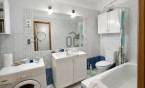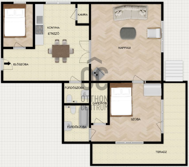 A lakás elrendezése rendkívül praktikus, hiszen három tágas szobája és két fürdőszobája maximális kényelmet biztosít.