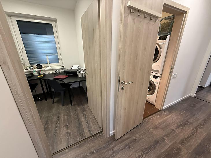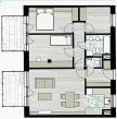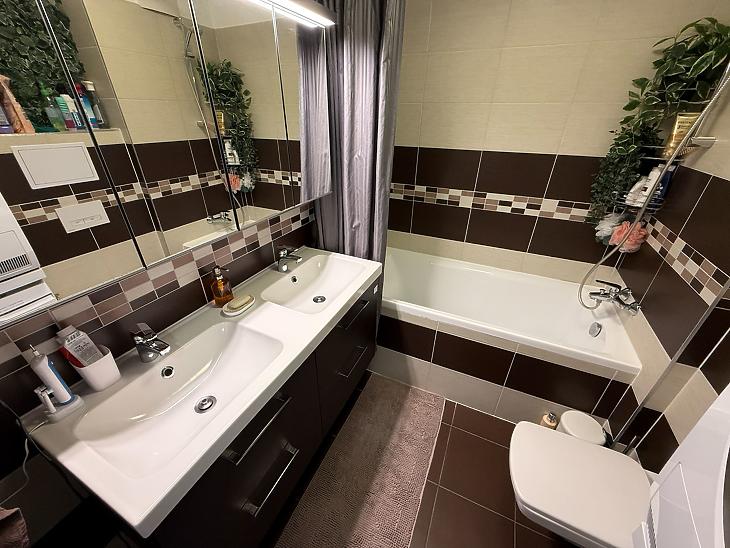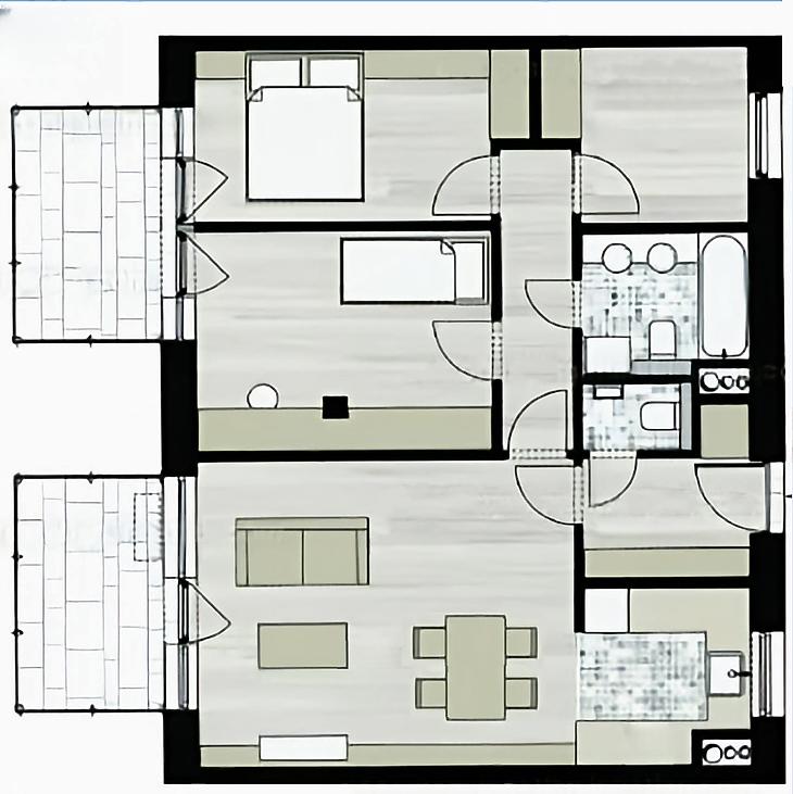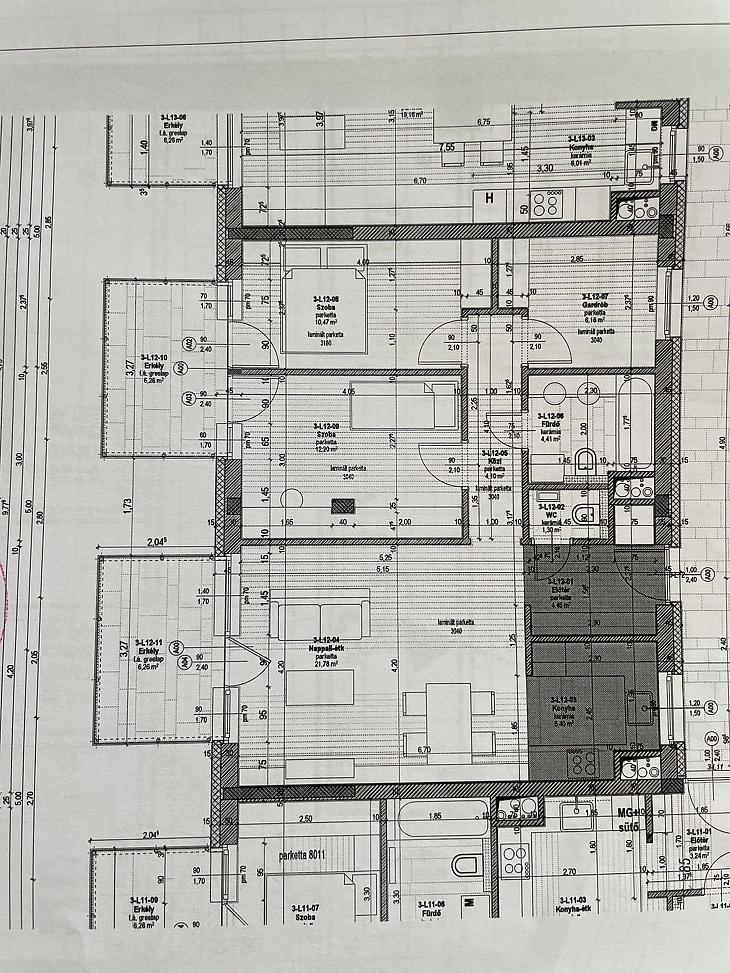 Amerikai konyhás nappali + étkező, 2+1 fél szoba, kádas fürdőszoba + wc, külön wc, közlekedő, előszoba, 2 darab 12 nm-es erkély.