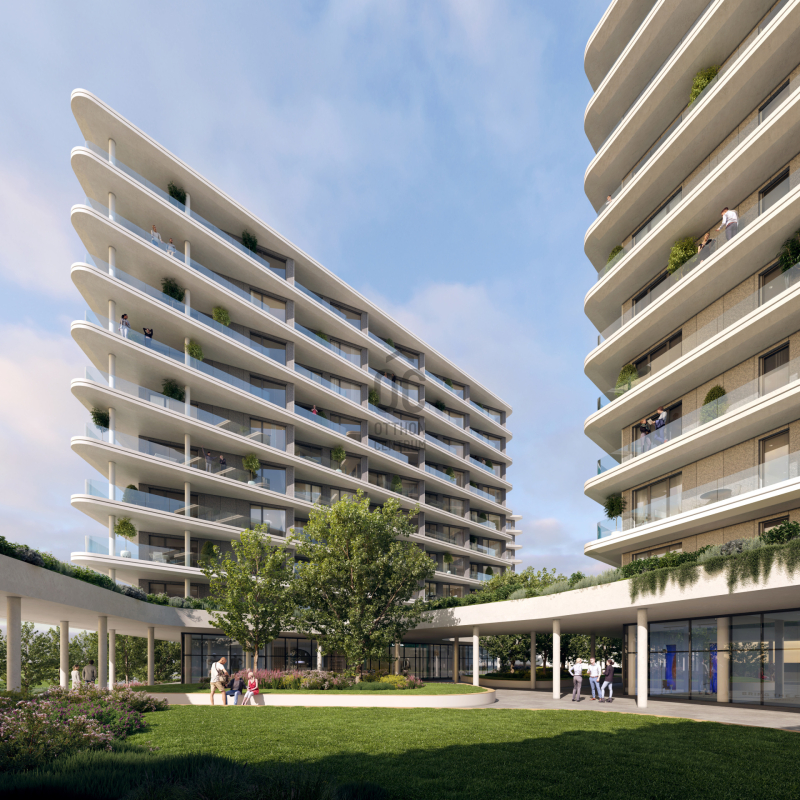 A lakóépületek modern, letisztult megjelenése a Duna vonalvezetését idézi.