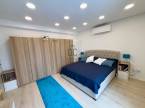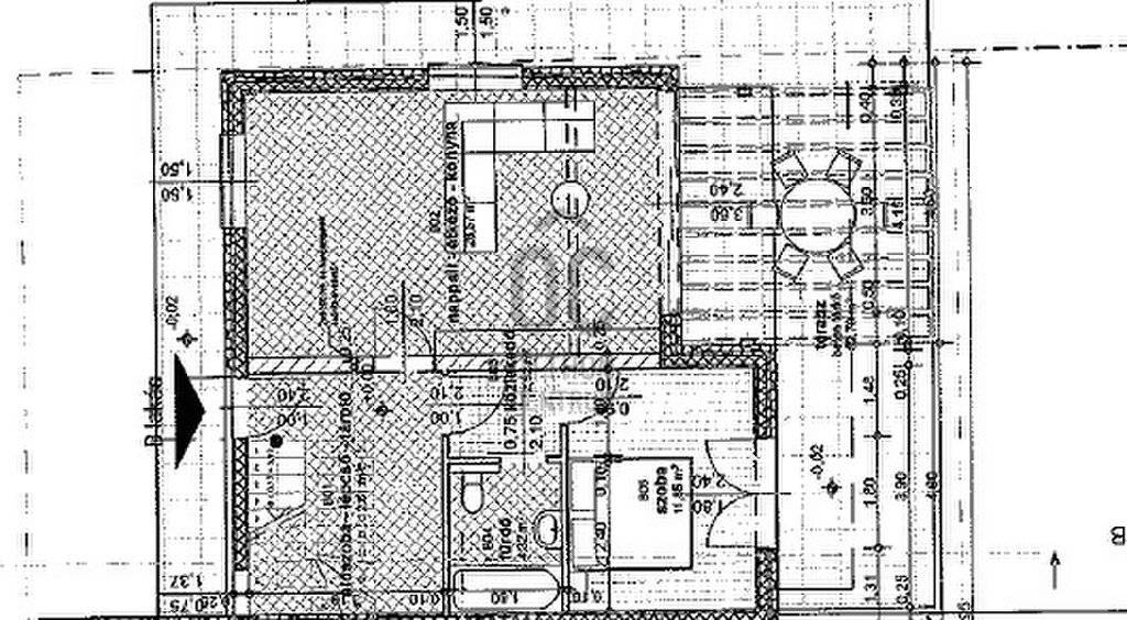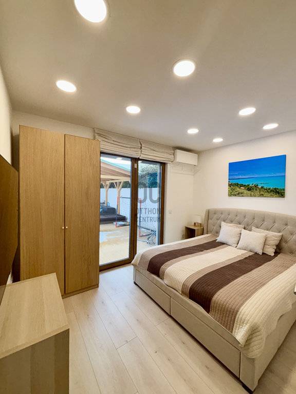 A modern ház belsejében, a földszinten tágas, világos amerikai konyhás nappali, közvetlen kijárattal a teraszra és a kertbe, 1 hálószoba, előszoba, háztartási helyiség, fürdőszoba wc-vel