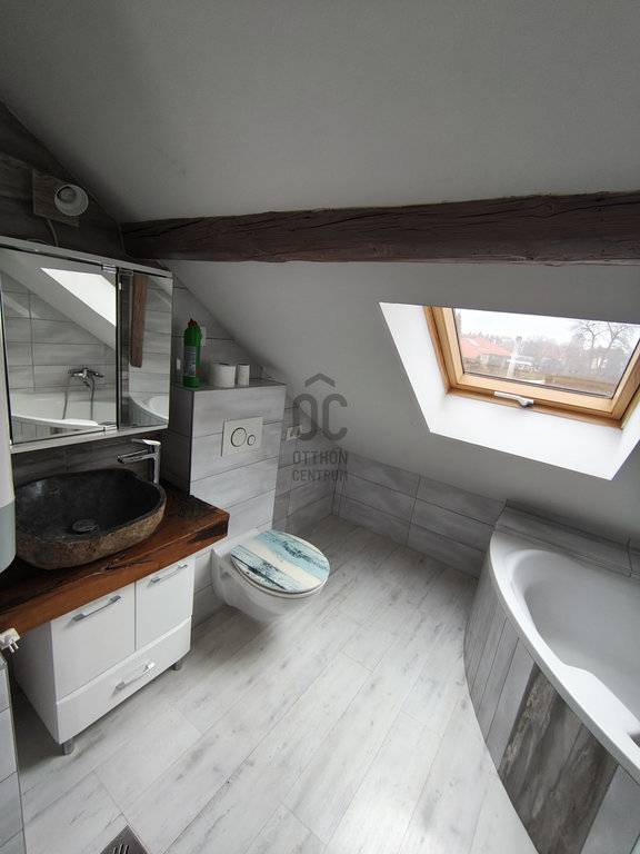 Beépített, fagerendás tetőtérrel bővült a ház, ahol egy nagy méretű hálószoba és fürdőszoba került kialakításra.