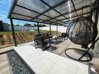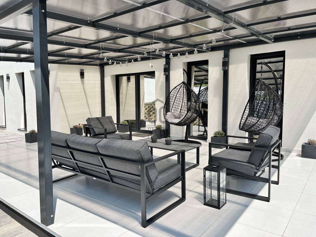 A házhoz épült egy 40 négyzetméter nagyságú, fém teraszfedéssel ellátott, kerámia lapokkal burkolt és kültéri bútorokkal igényesen berendezett terasz.
