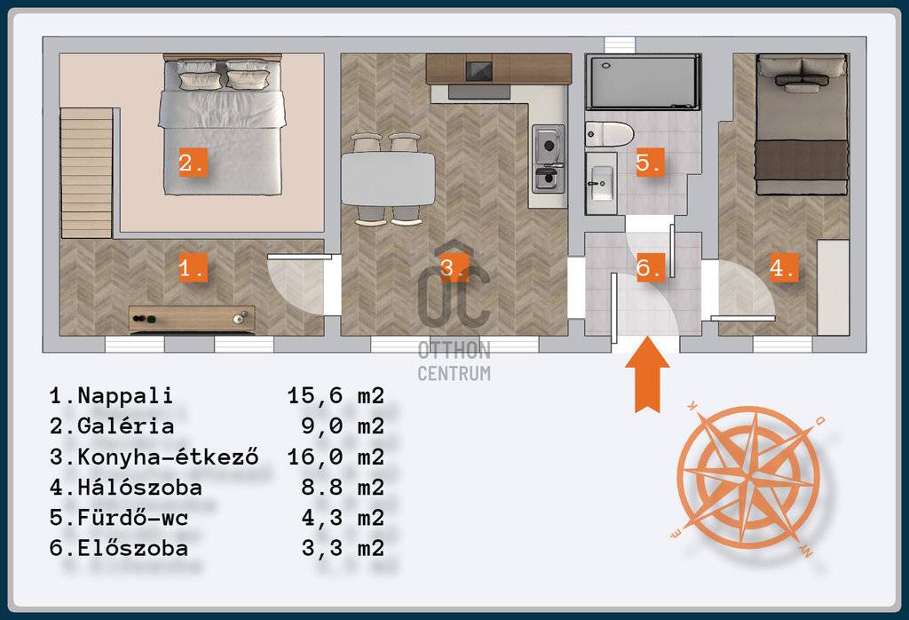 - Elosztása: előszoba, konyha-étkező, galériázott nappali, hálószoba, fürdőszoba-wc.