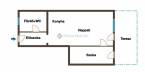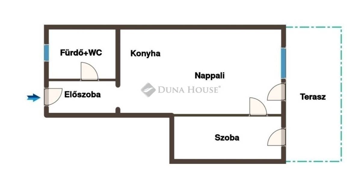 Belépés után az előszobában találjuk magunkat, ahonnan balra a kádas, ablakos fürdőszoba található. A bejárattal szemben a tágas, világos amerikai konyhás nappali helyezkedik el, amelyből eljuthatunk a nagyjából 10 nm-es hálószobába, valamint a teraszra és a saját használatú kertünkbe is.