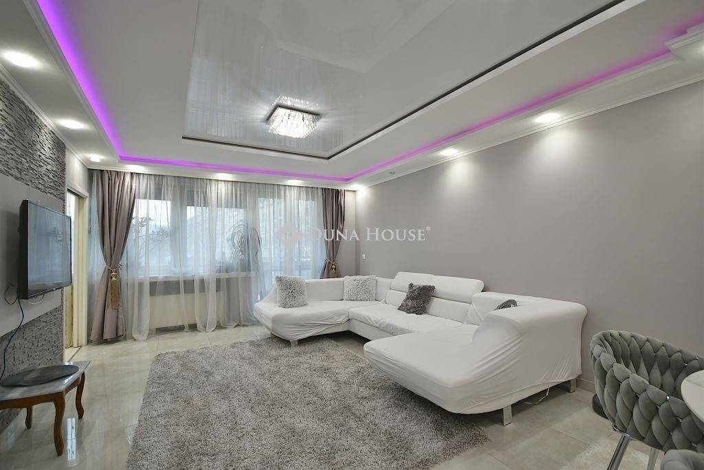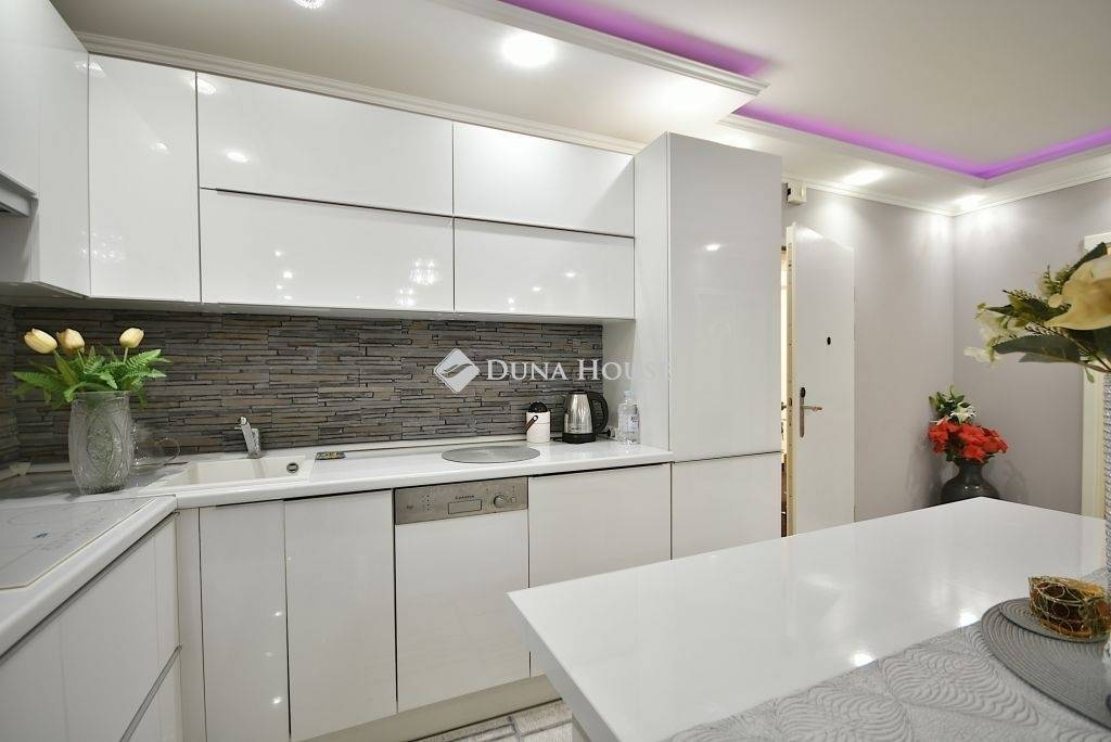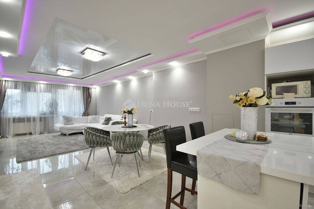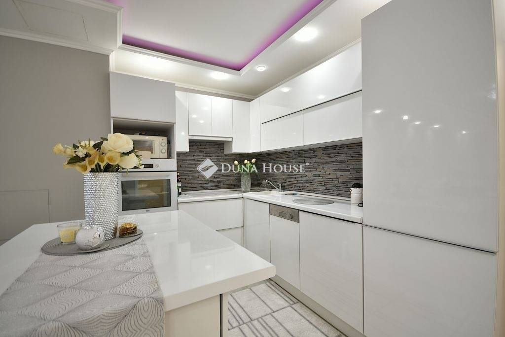 A lakás központi tere egy tágas, 40 m²-es amerikai konyhás nappali, amely beépített gépekkel felszerelt, világos, modern hangulatú.