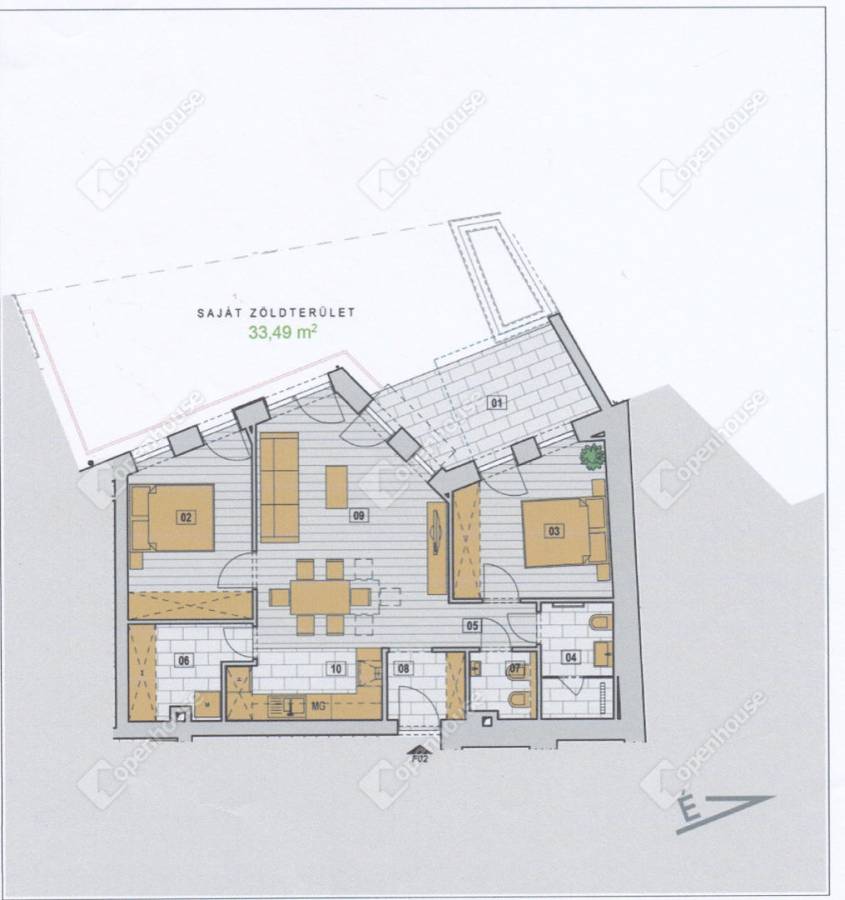 - 2 háló + nappali, háztartási helyiséggel, udvari terasszal, saját zöld területtel.
