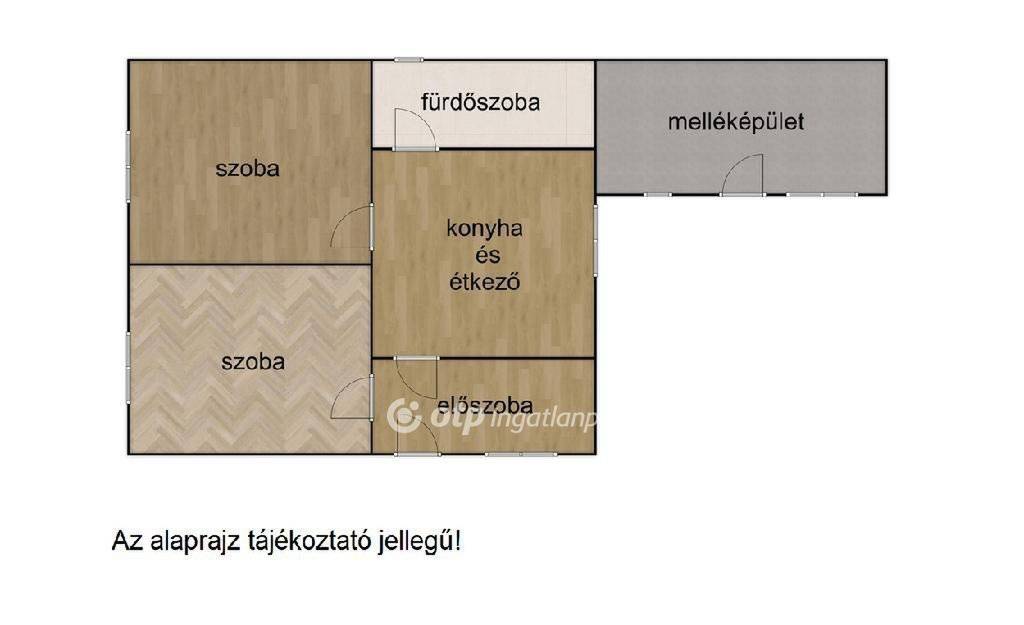 A ház elrendezése praktikus: 2 szoba, előszoba, étkező-konyha egyben, valamint fürdőszoba kapott helyet.