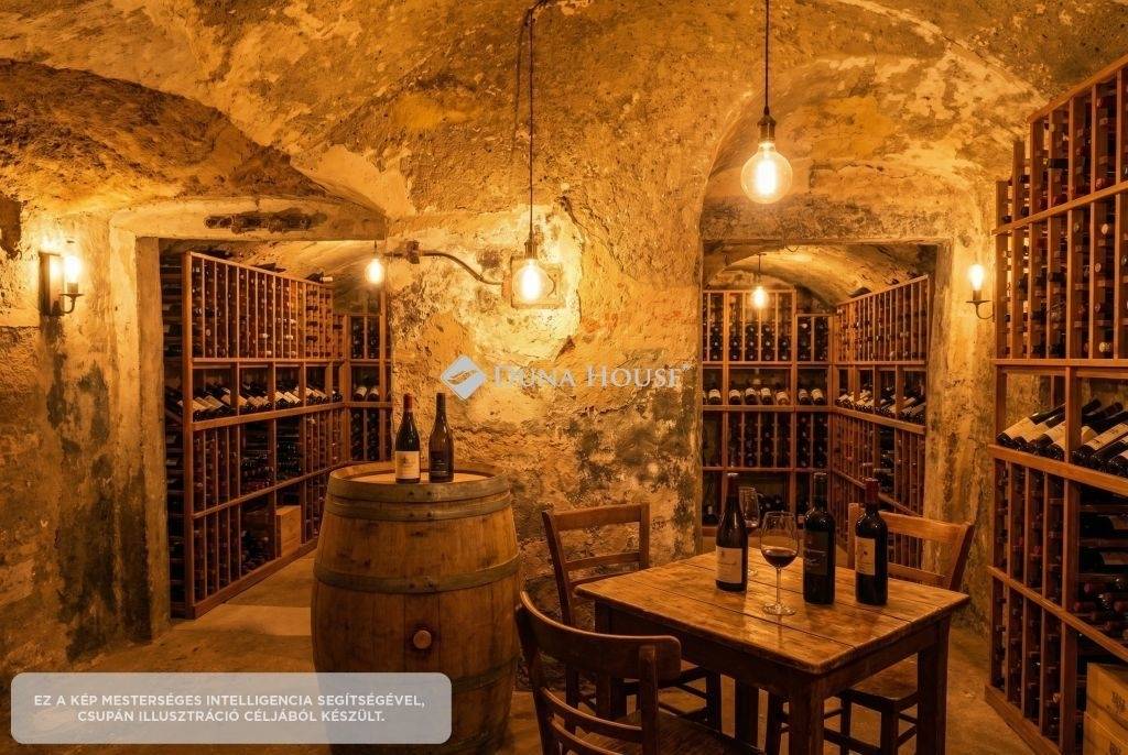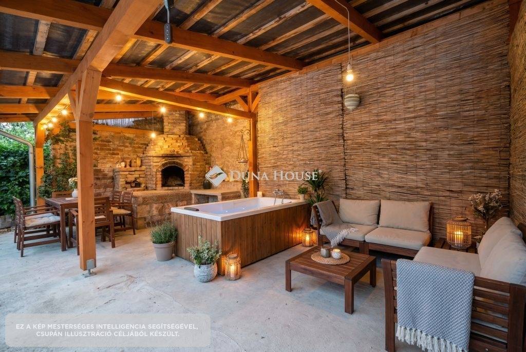 A 562 m²-es telek valódi pluszt ad: nagy udvar fedett terasz ahol már megkezdődött egy kemence kialakítása (AI kép), kültéri wellness, szauna kialakítására alkalmas épületrész (AI kép), pince, garázs (25 m²), több autó számára is kialakítható beállási lehetőség