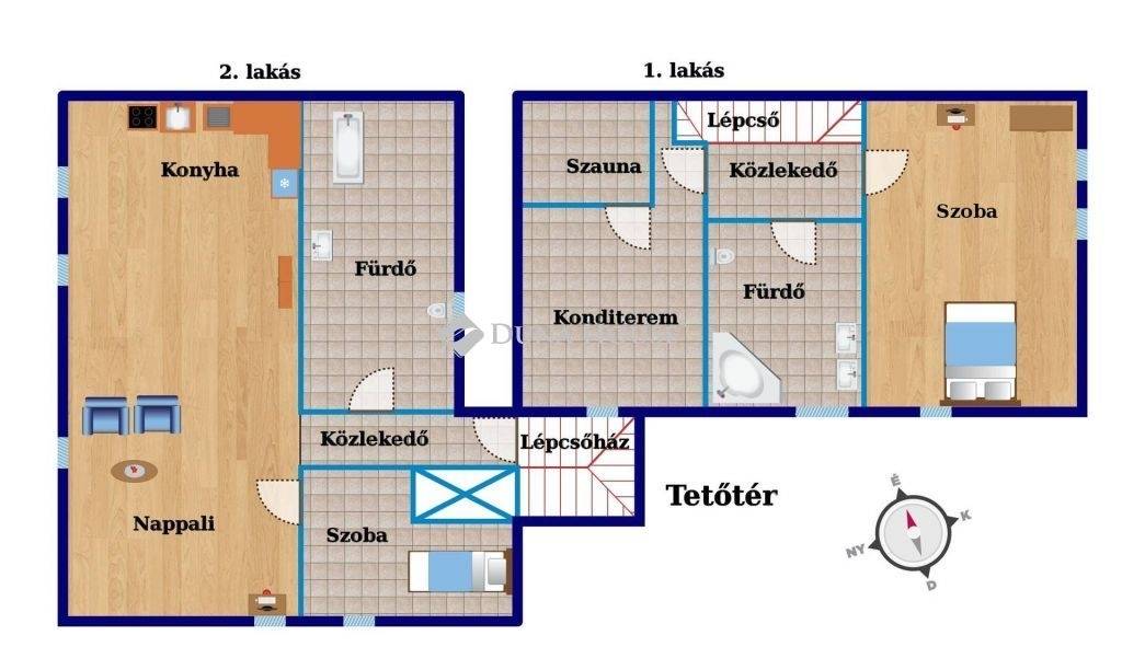 Az eredeti családi ház két szinten több mint 150 m2, míg az új lakás bruttó 69 m2 - nettó 44m2, saját lépcsőházzal. A földszinti nyílászárók kovácsolt vas ráccsal felszereltek.