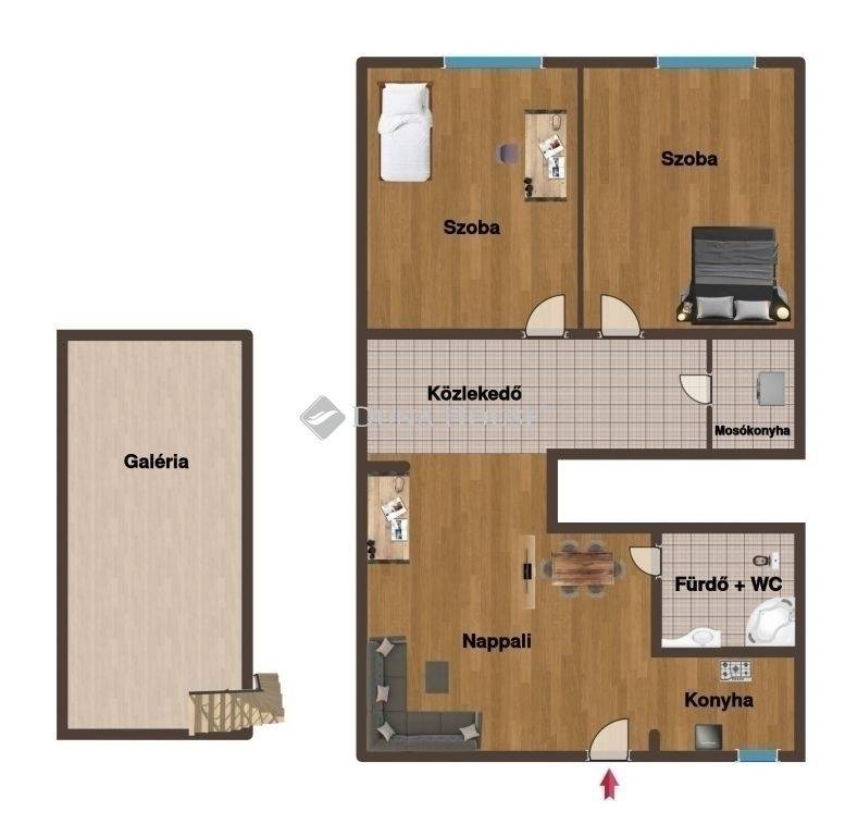 Az ingatlan két szobás, praktikus állógalériával, amely 12,5 m², 175 cm belmagassággal valódi, használható tér.