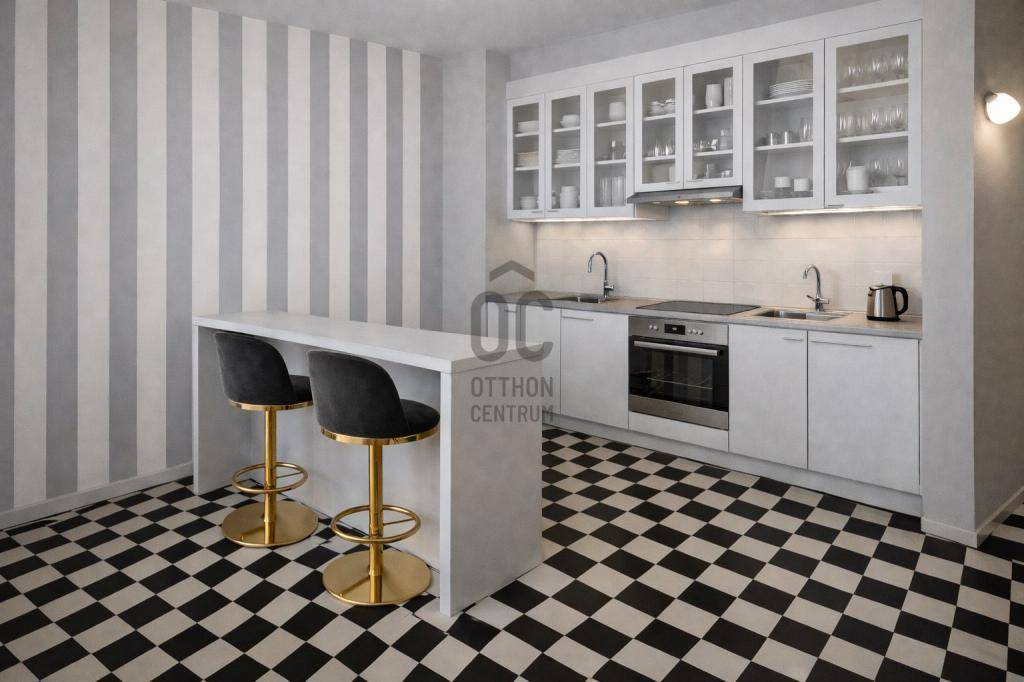 A méretes konyha-étkező is ablakos, az átalakítás során adja magát, hogy funkcióváltással szobát alkossanak belőle, mert a konyhát a lakás több egyéb pontján is el lehet(ne) helyezni.