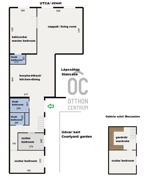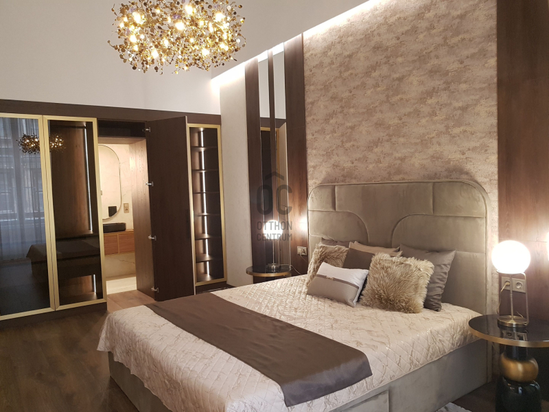 A lakás központi tere az impozáns, közel 40 nm-es nappali, mely a tágas (32nm) konyha-étkezőhöz csatlakozik. A fő hálószoba hozzá kapcsolódó fürdőszobával utcai nézetű, míg a két kisebb hálószobája ( 16 és 10 nm) a belső kertes udvarra néz. A közel 5 méteres belmagasságot kihasználva az udvari \\\"szárny\\\" felett épített galéria került kialakításra remek teret adva 3. hálószobának vagy dolgozószobának illetve itt lett berendezve egy mindent elrejtő gardróbszoba. A mindennapi kényelmet további két fürdőszoba biztosítja. A fűtés és a melegvíz ellátás kondenzációs gázkazánnal történik, a hűtésről klímaberendezések gondoskodnak.