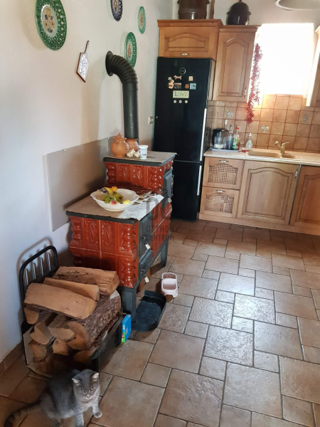 A nagy méretű konyhában beépített bútorok találhatóak teljes gépezettel és egy fatüzelésű cserépkályha jellegű sparhelt található.