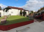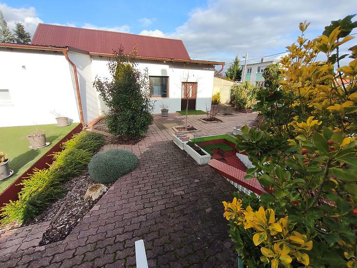 A kert nagy része térkővel borított, található benne egy sütögető, terasz alatti tárolási lehetőség, egy lejárat a pinceszintre, valamint egy 30m2-es, utcafronti könnyűszerkezetes garázs és egy úgyszintén könnyűszerkezetes 40m2-es tároló.