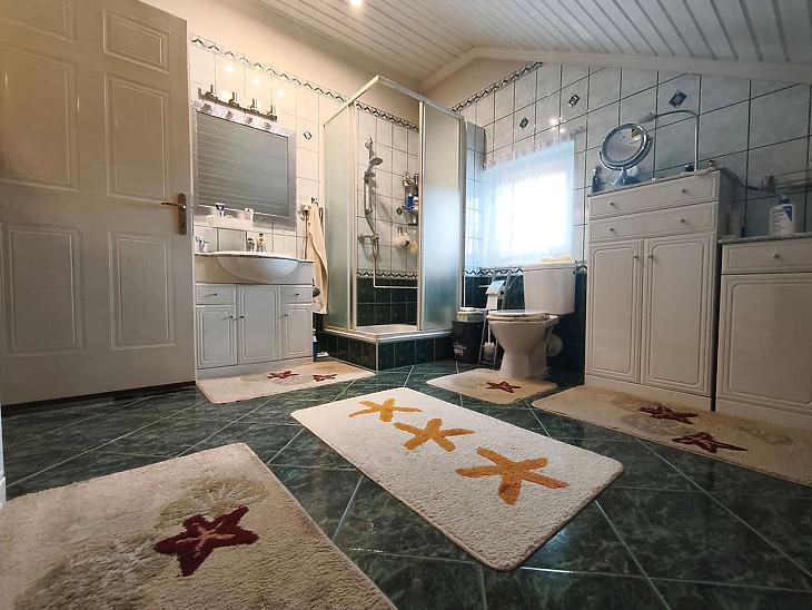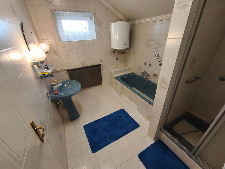 2. emelet: 2 szoba, zuhanyzós + kádas fürdőszoba, WC