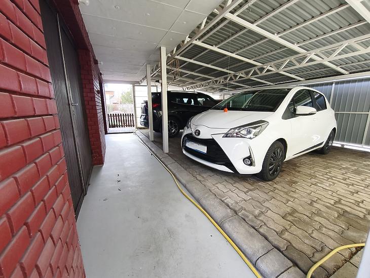 Az utcafrontról további 2 autó beállására helyet biztosító, elektromos tolókapuval felszerelt, fedett kocsibeálló lett kialakítva.