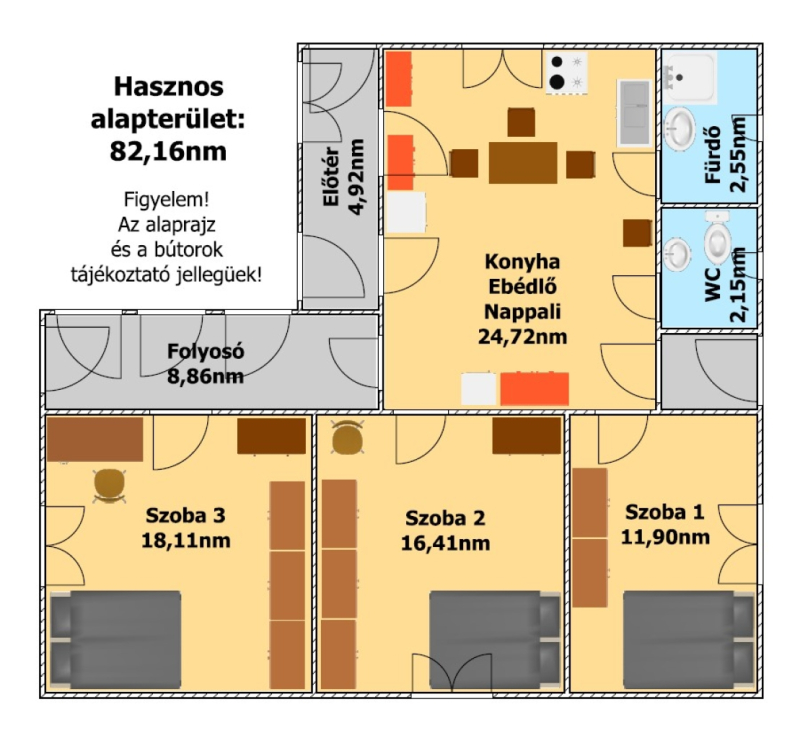A főépület hasznos alapterülete 82,16nm melyben található: