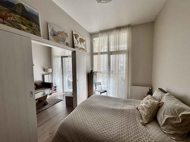 Az ingatlan praktikus elosztású: a konyha, az étkező és a nappali egy légtérben kapott helyet, ami tágas és modern életteret biztosít, emellett egy különálló hálószoba is rendelkezésre áll. A lakás utcai kilátásának köszönhetően kifejezetten világos és barátságos hangulatú. Tartozik hozzá egy erkély, amely kellemes helyszínt nyújt a reggeli kávézáshoz vagy esti pihenéshez, továbbá az 5. emeleten egy közös használatú terasz is a lakók rendelkezésére áll.