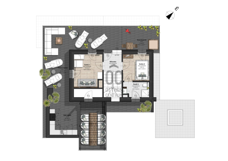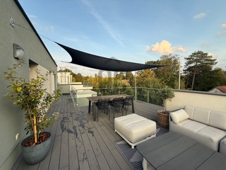 A 84 nm-es tetőterasz már önmagában is egy életérzés: elég nagy ahhoz, hogy egy kisebb- nagyobb társaság is élvezze, de pont olyan meghitt, hogy akár egyedül, egy könyvvel és egy pohár borral is tökéletes menedék legyen.
