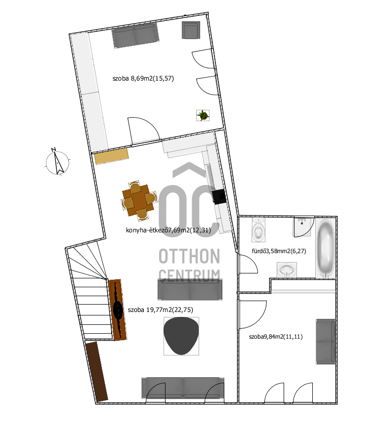 - A nappali a konyhával és az ebédlővel egy légtérben helyezkedik el