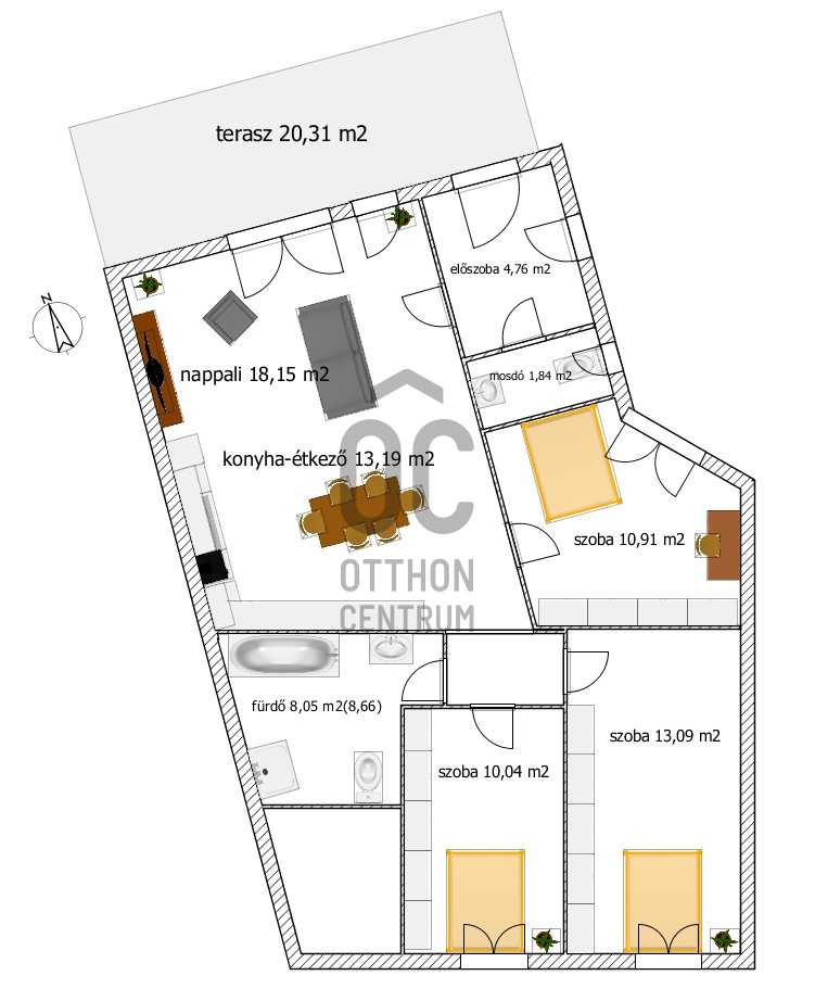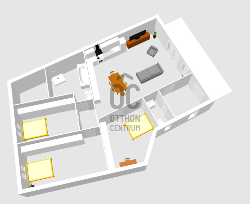 - A fürdőszoba sarokkáddal kerül átadásra, és ezen felül egy önálló wc is helyet kapott a lakásban