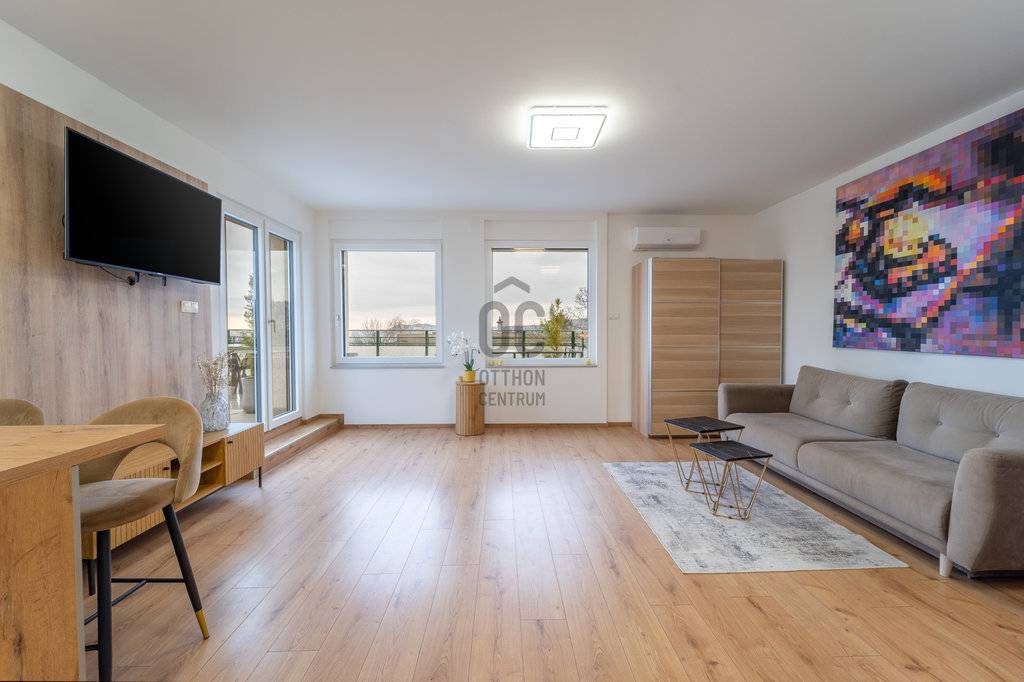 A lakás fűtése korszerű elektromos padlófűtéssel megoldott, amely tovább erősíti a letisztult, komfortos életteret. A konyha magasfényű, osztrák gyártású bútorzattal készült, beépített AEG és Bosch gépekkel; a konyhasziget a mindennapok természetes középpontja, ahol a design és a funkcionalitás magától értetődően találkozik.