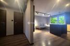 A nappali + előszobába álmennyezet lett kialakítva, sok világító lámpatest + a klíma csövezésének esztétikus, rejtett kivitelezése miatt.