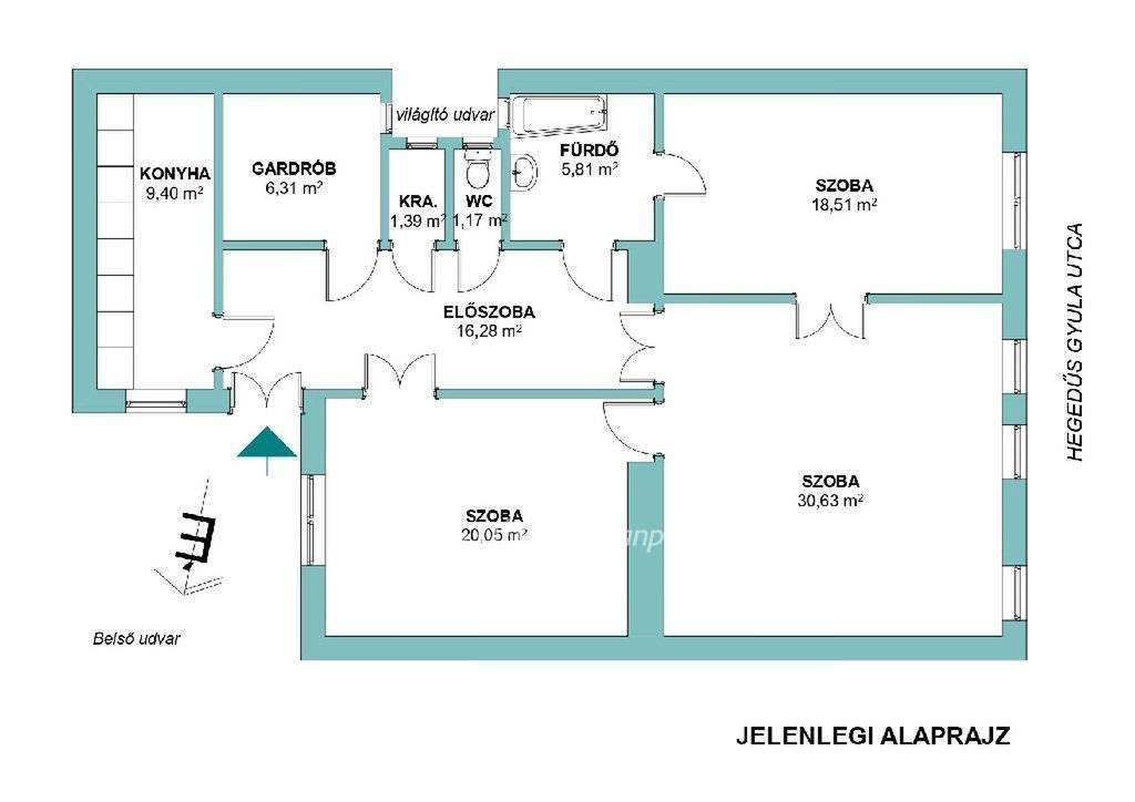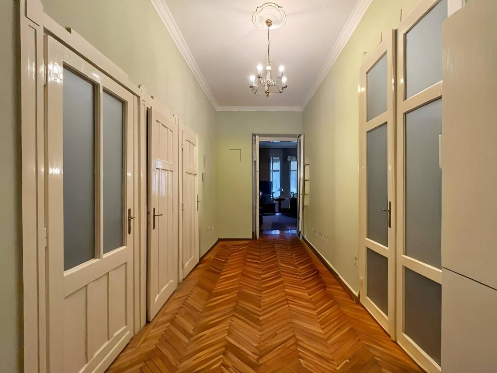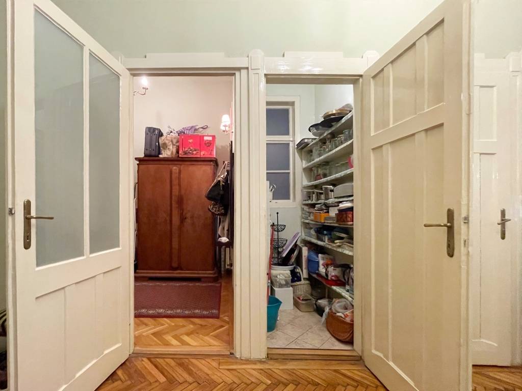 A lakásban három nagy méretű, nagy belmagasságú, szoba található, melyek közül 2 utcai, 1 pedig belső udvari fekvésű. Tágas előszoba, fürdőszoba, külön wc, gardrób szoba, kamra, és konyha található, klasszikus, a polgári lakásokra jellemző elrendezésben.