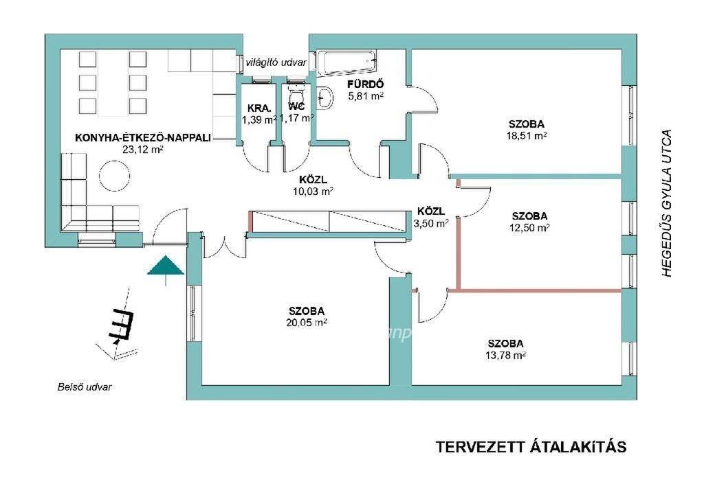 A mellékelt átalakítási alaprajz szerint kialakítható belőle egy konyha-étkező-nappali plusz 4 szoba elrendezésű modern otthon is.