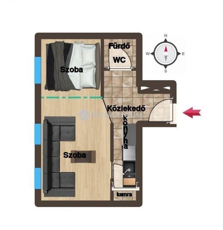 Szoba, konyha, fürdőszoba, önálló kamra, közlekedő.