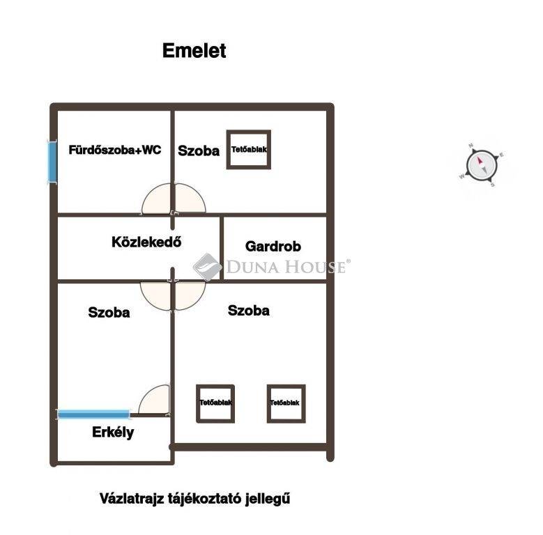 Az emelet (60 nm) 3 szoba, gardrób, fürdőszoba-WC, előtér helyiségeket foglal magában és egy erkély tartozik hozzá.ű
