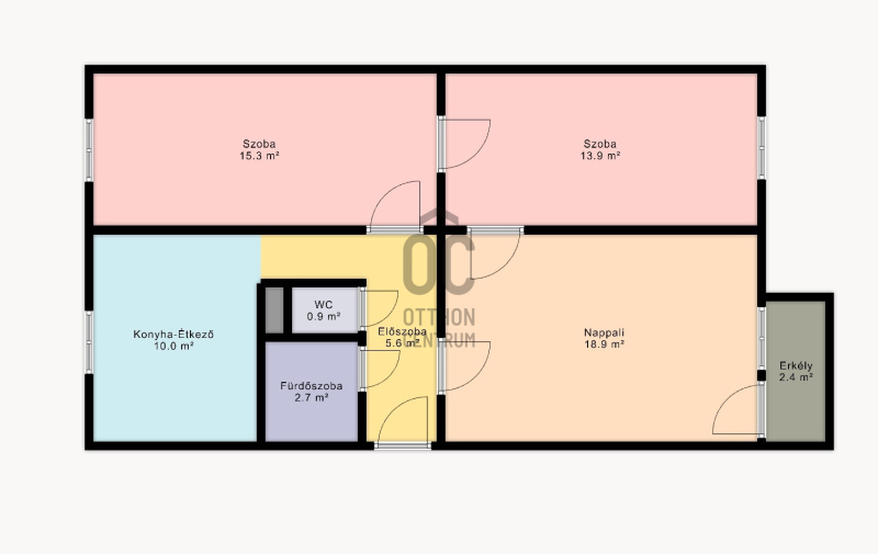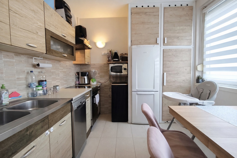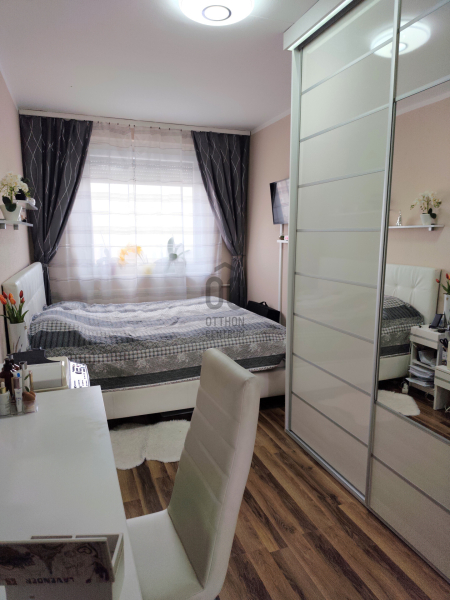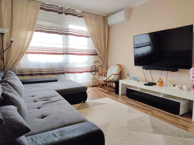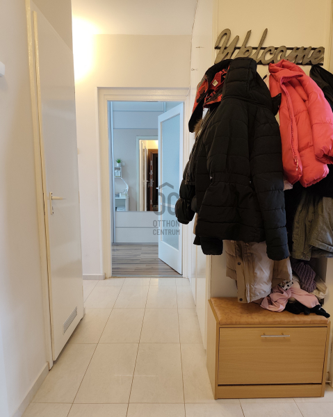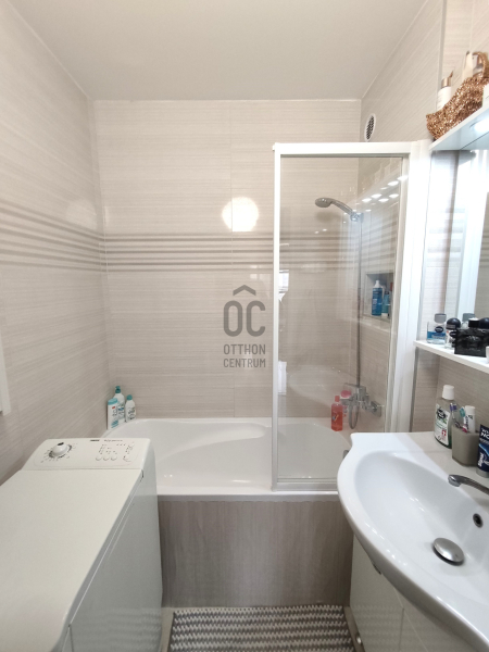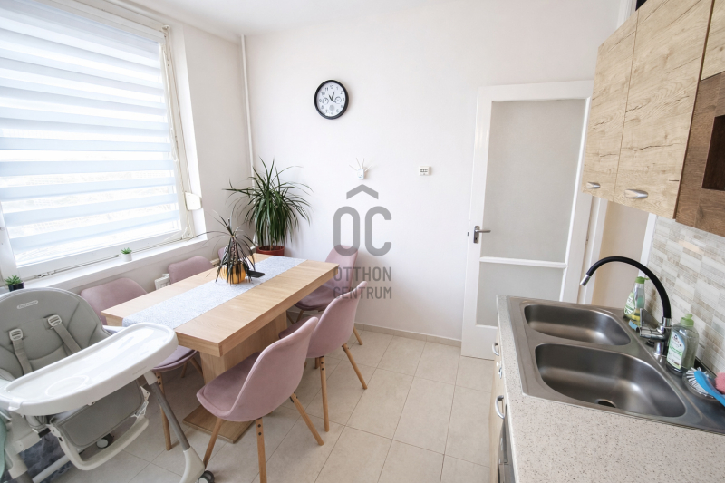A 68 m²-es, háromszobás ingatlan a társasház nyolcadik emeletén helyezkedik el. A jelenlegi alaprajz körbejárható, a helyiségek egymásból nyílnak, ami tágas térérzetet biztosít. Igény esetén egy könnyűszerkezetes válaszfal elhelyezésével a lakás három külön nyíló szobássá alakítható, és ezzel egyidejűleg gardrób vagy külön tárolóhelyiség is leválasztható. Az előszoba kifejezetten tágas, nagy méretű beépített szekrényekkel, amelyek praktikus tárolási lehetőséget biztosítanak a mindennapokban. A nappali erkélykapcsolatos, amely használható kiegészítő életteret jelent. A konyha-étkező tágas, világos, kialakítása lehetővé teszi, hogy akár többtagú család is kényelmesen le tudjon ülni az asztal köré. A fürdőszoba és a WC külön helyiségben található, mindkettő 2023-ban megújult. Ugyanebben az évben az elektromos hálózat korszerűsítése is megtörtént. A nappaliban klíma került felszerelésre. Az egyik szobában műanyag nyílászáró található, a többi helyiség fa ablakokkal rendelkezik. A fűtés és a meleg víz jelenleg mérés nélküli távhővel működik: a téli hat hónapban a havi költség 23.000 Ft, a nyári hónapokban 8.000 Ft. Az ingatlan tehermentes.