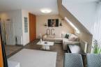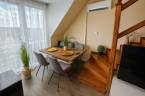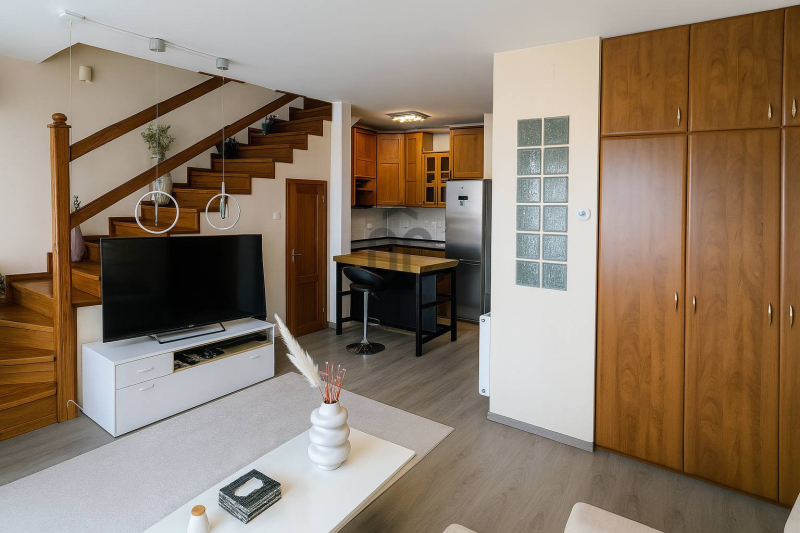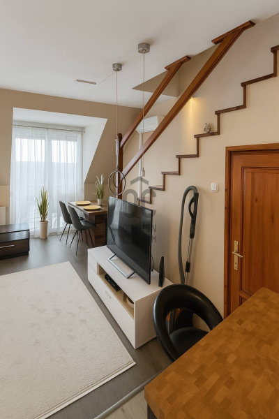 Az ingatlan a liftes társasház 4. emeletén található, 62m²-es, kétszintes (tetőtéri) kialakítású. Az alsó szinten egy világos, tágas, amerikai konyhás nappali kapott helyet, amelyhez franciaerkély kapcsolódik, valamint egy praktikus, lépcső alatti tároló.
