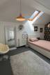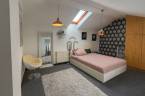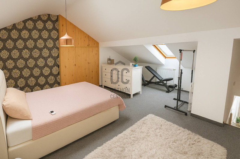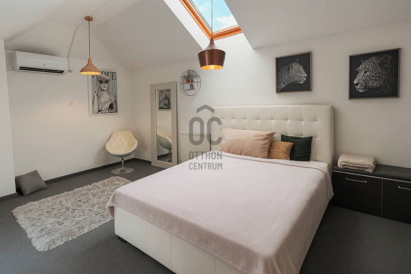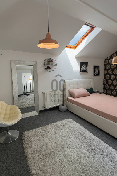 A felső szinten található a kifejezetten nagy méretű hálószoba, amely alapterületének köszönhetően (bruttó 25m², hasznos 19m²) igény szerint akár két különálló tárre is osztható, így a lakás rugalmasan alakítható két hálószobássá.