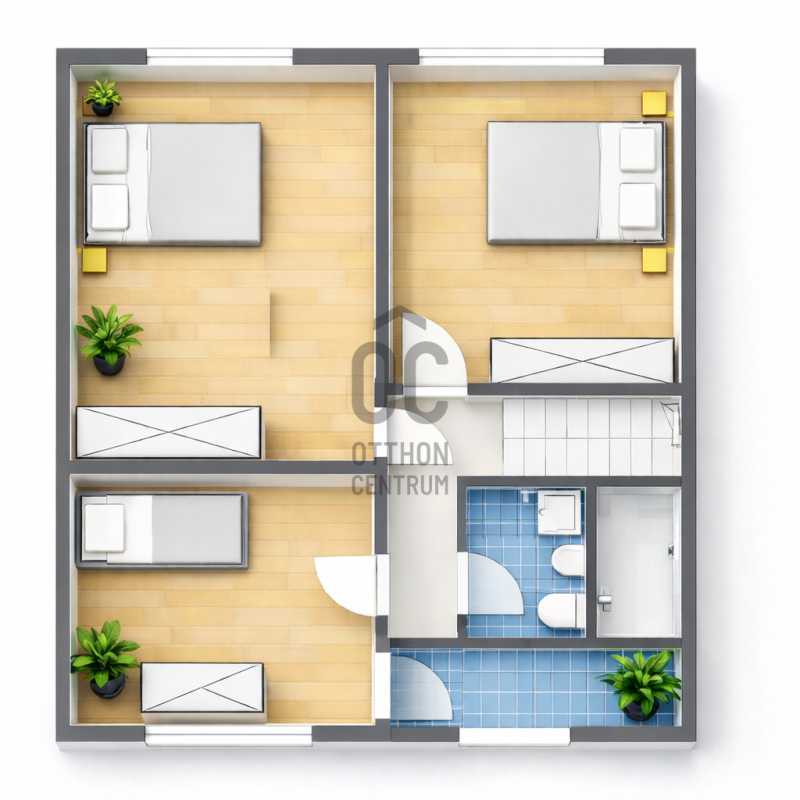 • emeleten: 3 hálószoba, fürdőszoba-WC, erkély