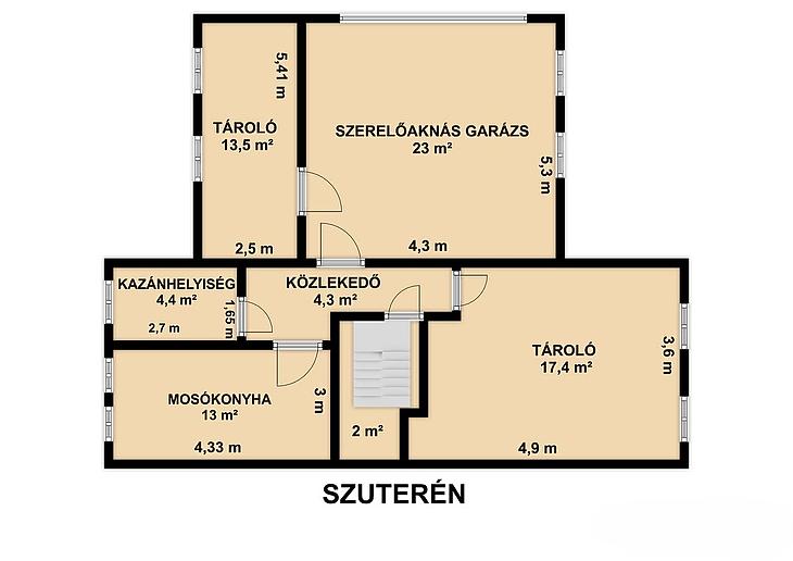 Szuterén: 2 tároló, közlekedő, mosókonyha, kazánház.
