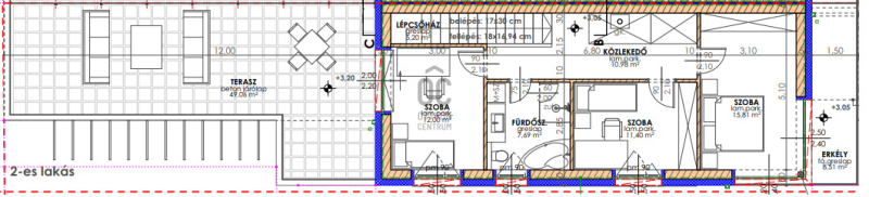 2.lakás: - szoba (12 m2) – fürdőszoba (7,69 m2)
