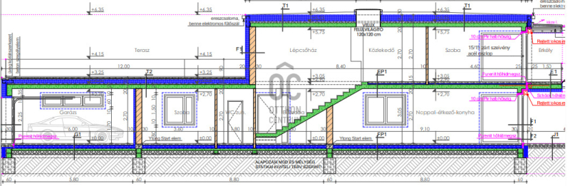 Nyílászárók: 90 mm 3 rétegű hőszigetelt üvegezéssel, elektromos garázskapu