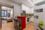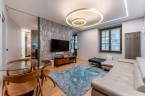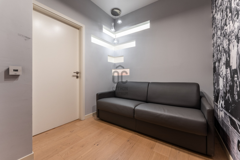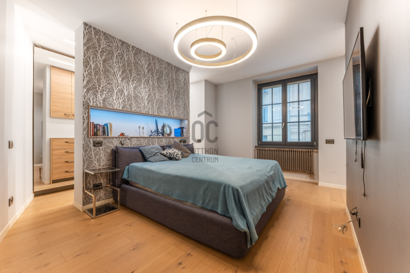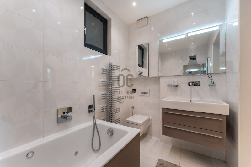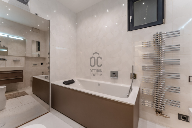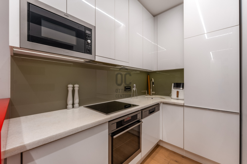 A fürdőszoba spa-hangulatú visszavonulótér, prémium minőségű szaniterekkel, whirlpool káddal és modern zuhanyrendszerrel. A burkolatok és részletek időtálló eleganciát képviselnek. A teljesen integrált konyha beépített gépekkel működik, a tér fegyelmezett és letisztult marad, miközben természetes találkozási pontként szolgál a lakás életében.