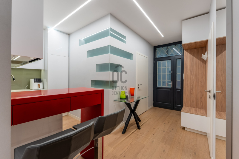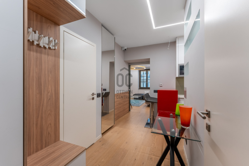 A félemeleti, 71 négyzetméteres, 3 szobás lakás 2018-ban teljes körű, műszakilag is átfogó felújításon esett át. A munkálatok a szerkezeti alapokig nyúltak vissza: a belső falak tégláig bontva, új gépészeti rendszerrel, korszerű elektromos hálózattal és minőségi burkolatokkal született újjá a tér. A felújítás során a cél egy hosszú távon fenntartható, precízen működő otthon megteremtése volt — nem ideiglenes esztétika, hanem tartós minőség.